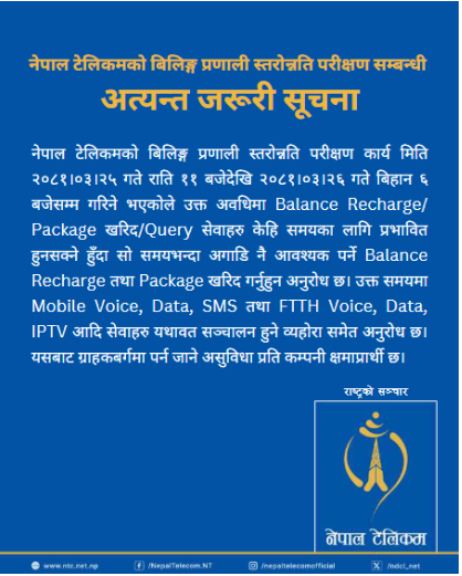 काठमाडौं : नेपाल टेलिकमले बिलिङ प्रणाली स्तरोन्नति परीक्षण गर्ने भएको छ । टेलिकमले मंगलबार एक सूचना जारी गर्दै बिलिङ प्रणाली स्तरोन्नति परीक्षण कार्य मंगलबार राति ११ बजेंदेखि बुधबार बिहान ६ बजेसम्म हुने जनाएको छ । यसकारण सो समयमा सेवा प्रभावित हुने कम्पनीले जनाएको छ । उक्त अवधिमा ब्यालेन्स रिचार्ज, प्याकेज खरिद तथ क्वेरी सेवाहरु केही […]
